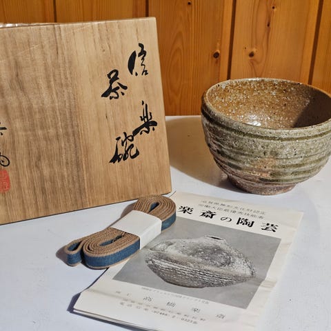 Aito Japanilainen musta Oribe keramiikka teekulho eli chawan. Taiteilija Mizuno Sokaku.