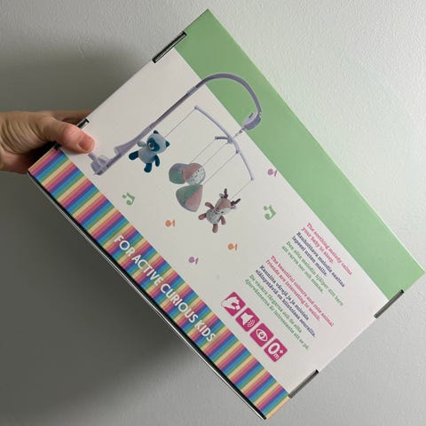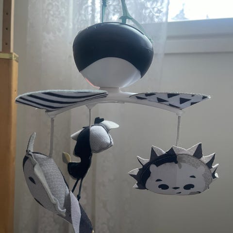 Sävelmiä, luonnon ääniä, pyörivä, valo. Itkuntunnistus. Ostettu uutena, yhdellä lapsella ollut.