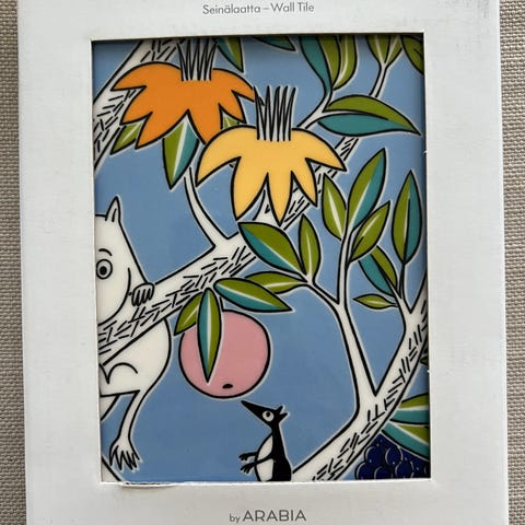 Uusi, alkuperäisessä pakkauksessaan oleva Arabian Muumi-koristepuun seinälaatta Tiuhti ja Viuhti.