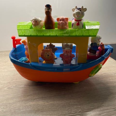 Huippulelu lapsille. Eläimet sekä Nooa &puoliso laitetaan sisään oikeanmuotoisista aukoista. Arkista aukeaa luukku, josta kaikki puretaan ulos ja taas voi aloittaa alusta.