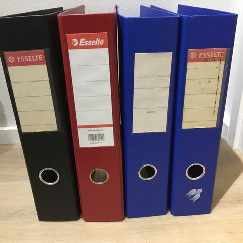Myydään 5 kpl setti mappeja, jossa on 4 leveää ja 1 kapea kansio. Hinta on paketin yhteishinta, mappeja ei myydä yksittäin.