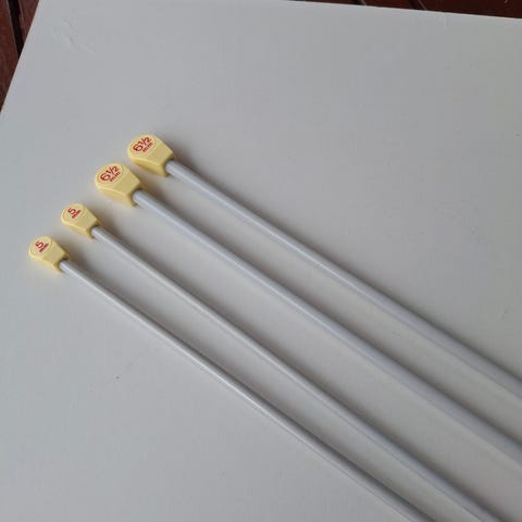Keltaiset muovipuikot, pituus 35 cm ja paksuus 8,0 mm. Ehjät ja hyväkuntoiset.
