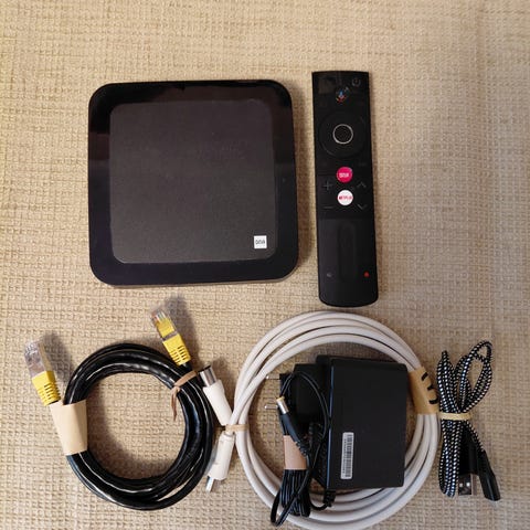 Käyttämättömäksi jääny boksi uuteen kotiin. Boksi, virtapiuha ja kaukosäädin