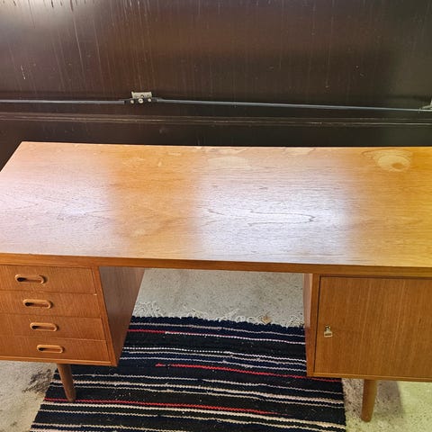 Kotimainen Lahden Puutyö Oy:n valmistama hyväkuntoinen, siistit laatikot, teak-viilu-työpöytä 70-luvulta. Lukittavat jaetut laatikot. Avain on. Tupakoimaton talous. Nouto Helsinki Metsälä maatasosta.