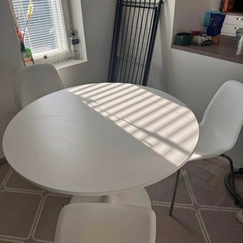 Korkea ruokapöytä johon kuuluu myös apupöytä ( voi pitää erillään tai yhdessä) mukaan kuuluu myös neljä valkoista tuolia joka kuvassa sekä mahdollisesti halutessa 2 ruskeaa saman mallista tuolia