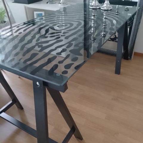 Lasilevy paksu karkaistu ja siten melko painava. Pysyy omalla painollaan paikallaan.