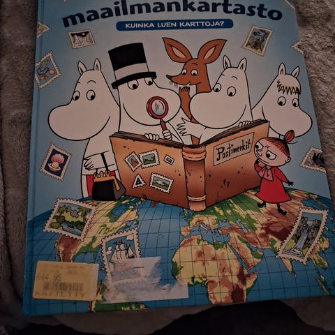 Myydään kirjat Muumit ja maailmankartasto, Afrikan savannit ja Dinosaurusennätyksiä.
