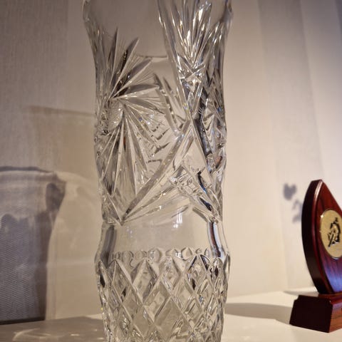 Iso kristalli maljakko. Maljakon tarran perusteella valkovenäläistä käsin leikattua kristallia.