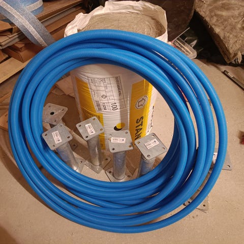 50mm paineputki jossa lämmityskaapeli ja uretaanieristys. Nykyisin näissä on yleensä solumuovi eriste, tämä on siinä suhteessa parempi. Voi käyttää vesijohtona tai vaikka paineviemärinä kun tarvitaan eristys. Sopii myös rakennusten väliseksi kanaaliksi kun tuonnehan mahtuu useampi pex-putki sisään. Tietäjät tietää mitä tällä voi tehdä.