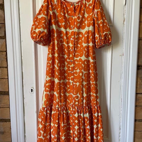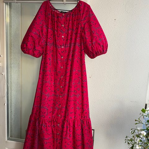 Ihastuttava punasävyinen Marimekko-mekko Rakkauskirje, Tarha-kuosi (Annika Rimala, 1963). Vintage-harvinaisuus puhvihihoilla, 100 % puuvillaa. Erittäin hyväkuntoinen, näyttävä ja elegantti juhla- tai romanttisiin tilaisuuksiin. Yksi omistaja.