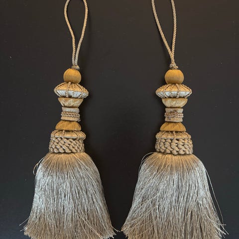 2 kpl. Kiiltävää valkoista silkkimäistä lankaa. Koko pituus tupsuineen 43cm. Hyvä kunto, kelpaa käyttää.