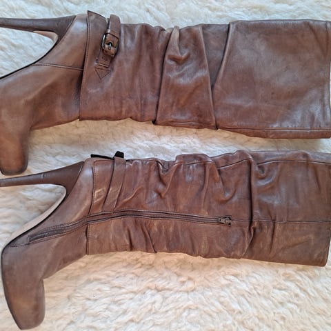 Musse & Cloud -merkkiset, Espanjassa valmistetut hyvälaatuiset nahkasaappaat. Aitoa nahkaa, myös sisäpohja nahkaa. Pitkä varsi (polven alapuolelle), nauhoitus ja vetoketju sisäsivulla. Käytön jälkeä näkyy jonkin verran mm. kärjissä kulumaa, saa lankkaamalla varmasti hyväksi vielä. Yleisilme siisti.