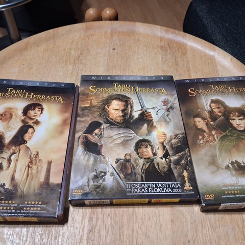 3 kpl DVD:itä Taru Sormusten Herrasta: Sormuksen ritarit, Kuninkaan paluu ja Kaksi tornia. Pahvikannet hiukan käytössä kuluneet, mutta DVD:t toimii.