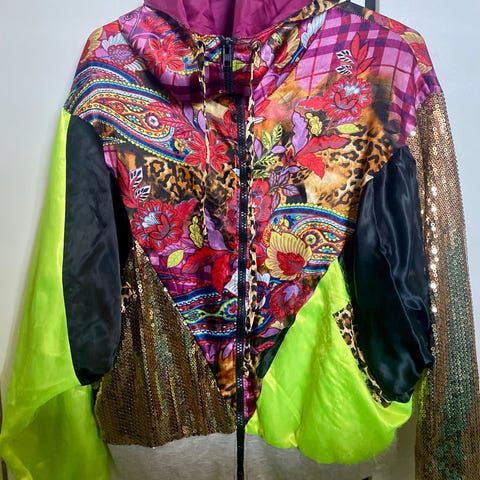 Hieno kevyt takki joka on koristeltu aasialaisilla ornamenteillä, käsityö, koko 40