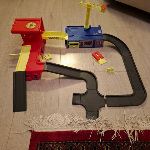 Koottava paloasema. 99 osaa. Vm. 2002. Käytetty vuoden ajan. Sisältää ohjeet. Salaluukun lukitus ei toimi. Yksi kiinnitystappi poikki yhdessä osassa.