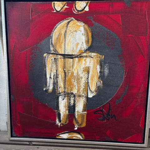 Silkkikankaalle maalattu, liikkeessä kehystetty painava taulu.