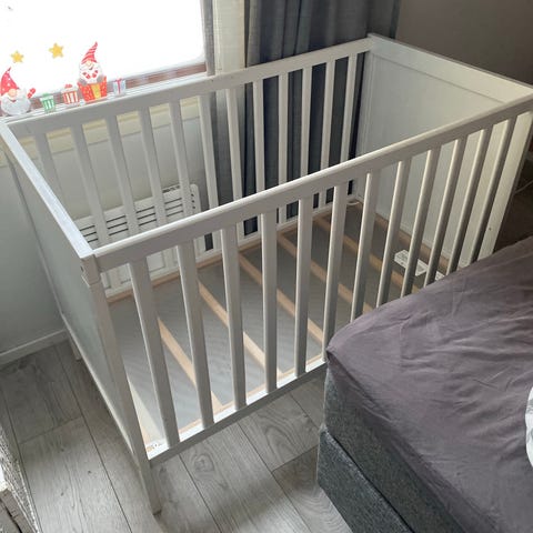 Yhdellä lapsellä käytössä ollut IKEAn pinnasänky, pohja säädettävä kahdelle korkeudelle.