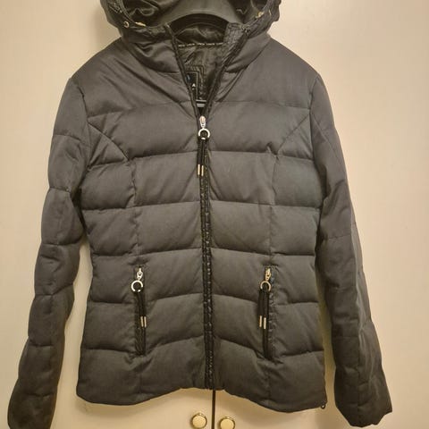 Musta tai erittäin tumman ruskea, omaan silmään musta, Kaija S untuvatakki. Koko puuttuu, kai-kai n. 60 cm, olisiko koko XL. Ohut.