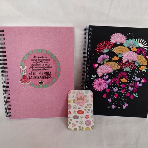 A5-kokoinen journal, jossa on pinkki ja värikäs kansi. Sisältää pisteviivalla varustetut sivut ja kuminauhakiinnityksen. Sopii muistiinpanoihin ja luonnosteluun.