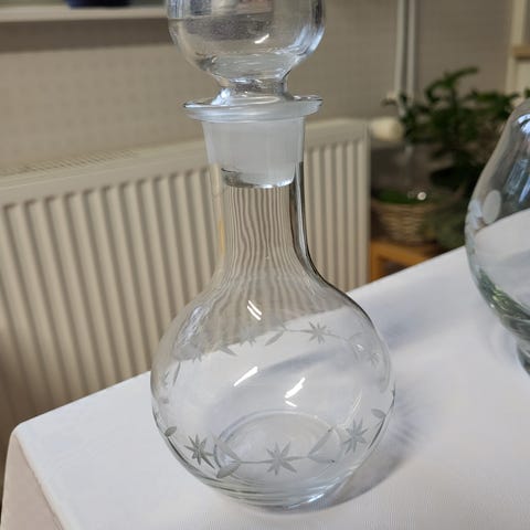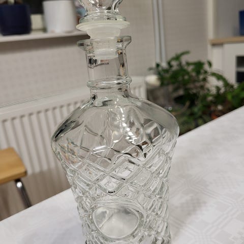 Mielenkiintoinen karahvi. Jonka korkki voi käyttää snapsilasina, sileä pohja. Karahvi suuaukosta riksu, huomioitu hinnassa . Liikun alueella Lahti-Heinola-Mikkeli-Savonlinna-Parikkala ja kauppa mielellään kasvokkain, jotta ostaja voi tarkistaa tavaran