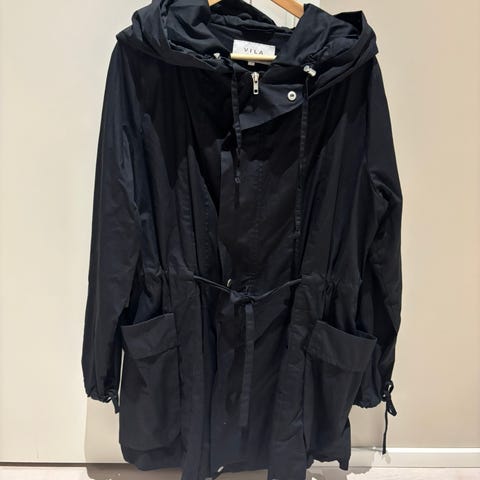 Vilan hupullinen talviparka. Huppu irrotettavissa. Myös hupun reunuksen karva irrotettavissa. Takissa on vetoketjullinen suljenta ja neljä taskua etupuolella. Sisustasta ainakin osa on untuvaa, mutta tuotelappu on niin kulunut, että tarkkaa tietoa ei ole antaa. Takissa on vasemmassa hihassa kaksi pientä reikää(ommeltu umpeen), ks. kuva.