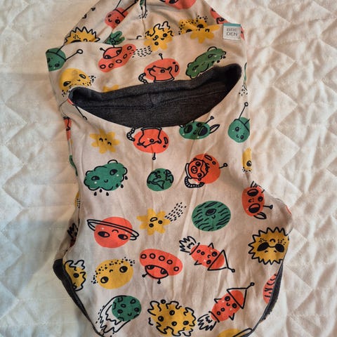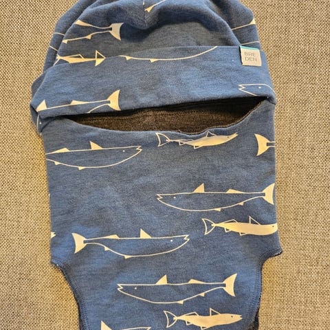 Vaaleansininen lipallinen kypärämyssy merinovillavuorella kokoa 53/55cm. Päällyskankaan väri on haalistunut ja siinä näkyy värjäymiä käytön jäljiltä, jotka eivät lähde hellävaraisella pesuaineella. Sopii vaikka "kakkospäähineeksi" pihaleikkeihin.