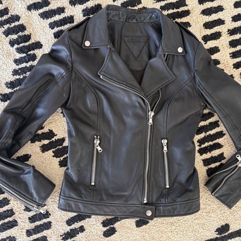 Samsøe Samsøe nahkatakki, koko S, musta väri. Materiaalina lampaannahka (päällinen), viskoosi (vuori), polyesteri (hihojen vuori). Takissa vetoketjutaskut ja vetoketjulliset hihansuut. Malli istuva.