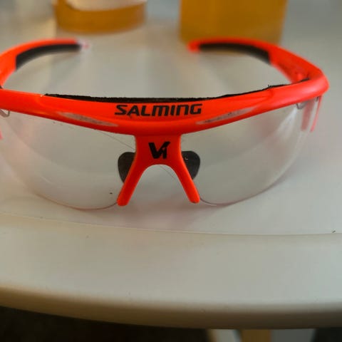 Erittäin hyväkuntoiset Salming suojalasit. Linsseissä pieniä hentoja naarmuja. Mukana tulee suojapussi.