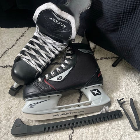 Luistimilla pelattu jääkiekkoo käytön jälkiä löytyy muuten hyvässä kunnossa terät pystyy vaihtaan ja terät kohttuu kunnossa