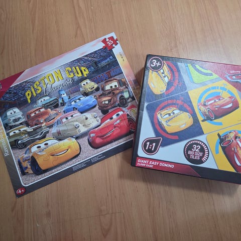 Disney Pixar Cars domino lattiapeli isoilla 19,5 cm pahvilaatoilla. Kaikki osat tallella ja ehjiä. Tällä on pelattu paljon, joten osassa laatoista on kulumaa.