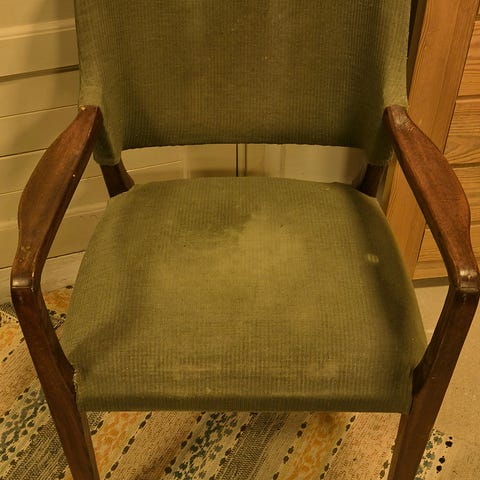 Vanha puinen nojatuoli. Ehjä ja tukeva, mutta vaatii uuden maalikerroksen.