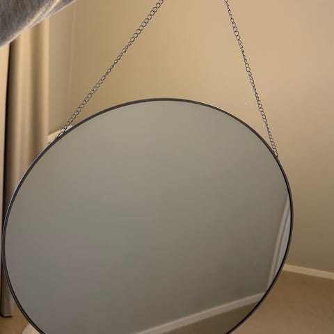 Mustareunainen pyöreä peili, hallaisijaltaan peili 40cm. Huolellisesti kiinnitetty nahkahohna, leveys n 1,5cm. Kävi muuton myötä tarpeettomaksi. Siistissä kunnossa.