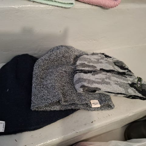 Lasten tummansininen solmio, kravatti, kuminauhakiinnitys. Polyesteriä. Pituus n.10cm ja leveys 4.3cm. Hyväkuntoinen. Ylhäällä kuvassa siistikuntoisia pipoja 3kpl n.3-5v. sopivia. Vasemmalla alhaalla talvihattu koko 110/128cm (4-8v.), huivi ja 4kpl tuubihuiveja, turkoosit pientä kokoa olevat lapaset. Oikealla ylhäällä kahdet lasten S koon hanskat (nämä käytössä kuluneet), alhaalla oikealla kuvassa kahdet sormikas hanskat, koko 4. 1€/kpl.