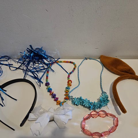 Erilaisia lasten ja nuorten hiuskoristeita ja asusteita. Setti sisältää erilaisia hiuslenkkejä, pantoja, hiusklipsejä ja rannekoruja. Osa käyttämättömiä ja kaikki on puhdistettu.