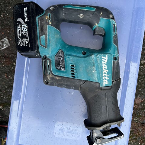 Makita akkupistosaha. Käytön jälkiä mutta täysin kunnossa oleva, tarpeettomana. Säilytyslaatikkoa ei valitettavasti ole..