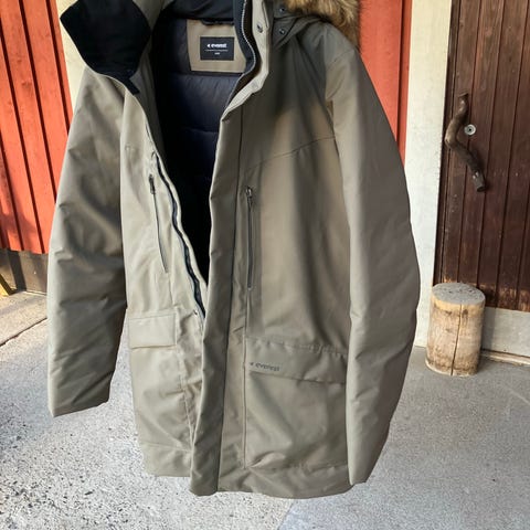 Everest miesten oranssin parkatakki, koko M. Kaksisuuntainen vetoketju ja isot nappitaskut edessä. Taskun läpän alla pientä tummentumaa (tästä kuva). Ei näy käytössä.