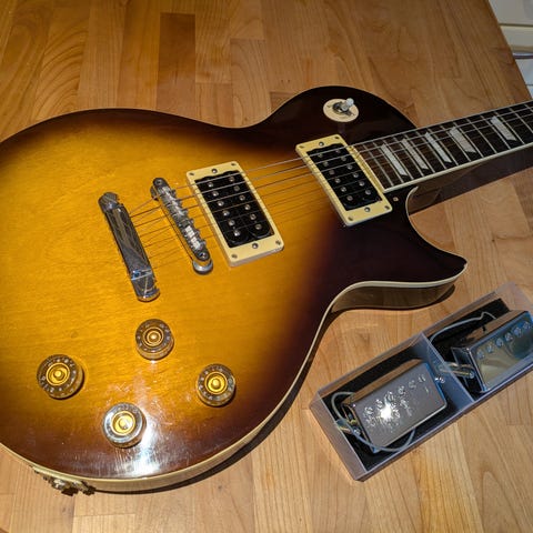 Tarjolla japanissa valmistettu loimukantinen Greco Les Paul, jossa mikrofoneina Maxonin keräilyharvinaisuudet vuodelta 1974. Tehty Japanissa, eli MIJ.