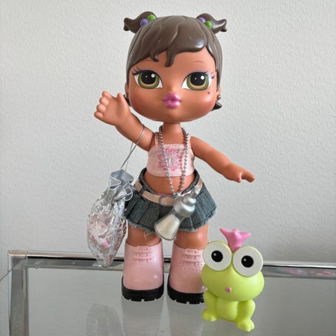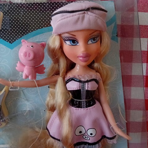 Ihana Bratz Yasmin sammakkoineen, soittimineen ja matkalaukkuineen.