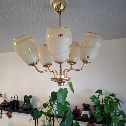 Siinä on kauniisti kiiltelevät messinki- ja lasisomisteet. Viisi kerman väristä lasikupua, joissa tyylikäs kullanvärinen raita. Yhdessä kuvussa (kuva 5) näkyy mahdollinen halkeama muuten ei huomioitu poikkeavuuksia. Tarvitsee kiillotuksen.