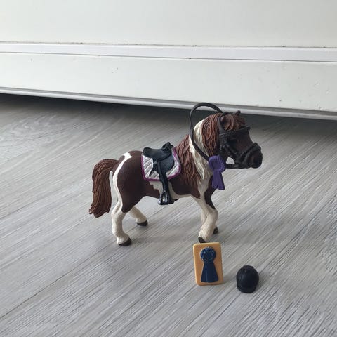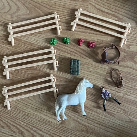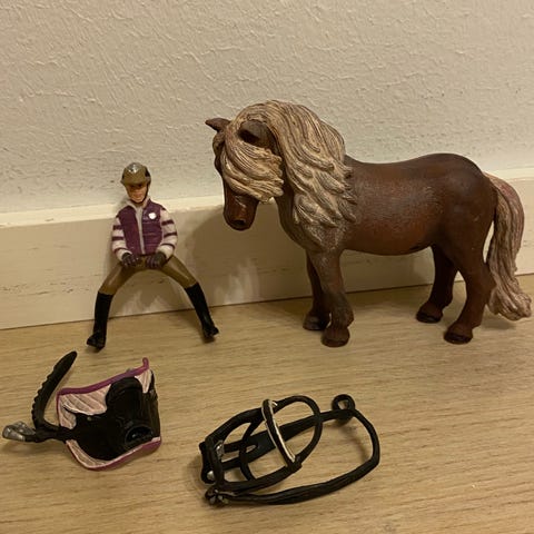 Schleich setti, jossa ratsastaja Vilma, islanninhevonen, satula ja suitset sekä ruokia.