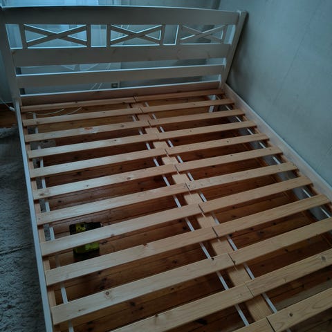 Suoraan käytöstä poistettu parisänky. Molempien patjojen alla kaksi isoa säilytyslaatikkoa.