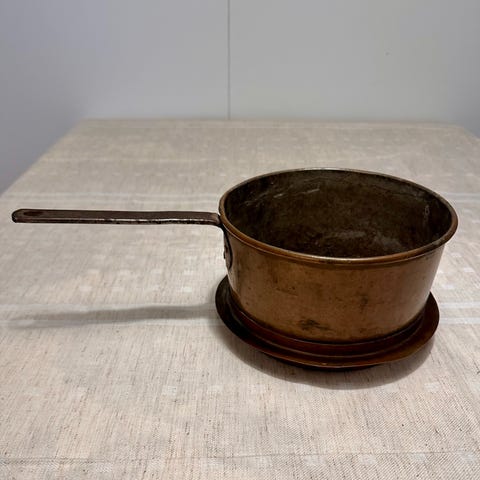 Kuparinen kattila, jossa on kansi ja pitkä kahva.