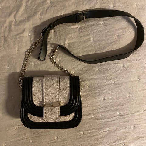 GUESS tekonahkainen olkalaukku naisille valkoisena. Laukussa on ketjulla ja säädettävällä hihnalla varustettu olkahihna. Laukun etuosassa koristeellinen rusetti ja GUESS-logo. Laukku on kooltaan keskikokoinen, sopiva arki- ja vapaa-ajan käyttöön. Mitat lev. 24cm, kork. n.16cm, syv. n. 4cm.