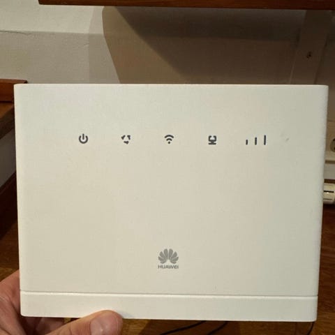 Huawei reititin valkoinen, sisältää useita Ethernet-portteja ja virtalähteen. Käytettävissä langattomaan verkon jakamiseen kotikäytössä tai pienissä toimistoissa.