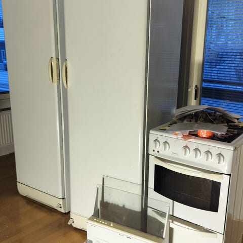 Jääkaappi, pakastin, lattiahella ja talotuuletin/ liesituuletin