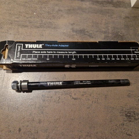 Uuden veroinen akseli polkupyörään Thulen kärryn liittämiseksi.