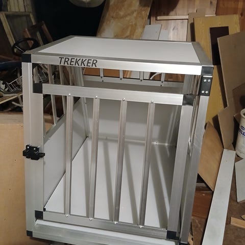 Kuvan Ferplast häkki sekä toinen musta metallinen häkki. Käyvät pienehkölle keskikokoiselle koiralle. H; 10 euroa/ kpl. Nouto