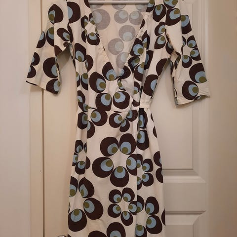 Uudenveroinen mekko, laadukasta mustaa läpinäkymätöntä ja joustavaa kangasta, mukava päällä. Menee nätisti vartalonmyötäisesti. Päällimmäinen kangas avautuu ja solmitaan vyötärölle. Sisempi kangas ei avaudu vyötäröstä alaspäin. Hajusteeton pesu, savoton ja lemmikitön talous.