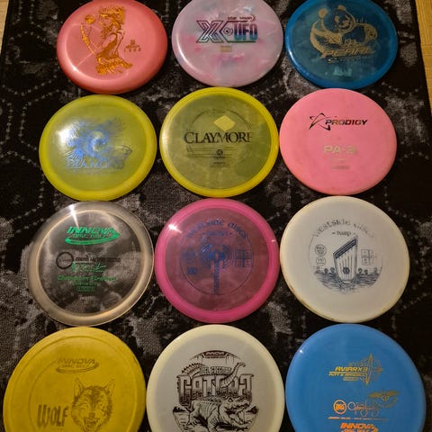 Kokoelma frisbeegolf kiekkoja eri väreissä ja eri merkeiltä. Kiekot on valmistettu muovista ja soveltuvat frisbeegolf-peliin. Kiekkojen koko ja paino vaihtelevat mallin mukaan.