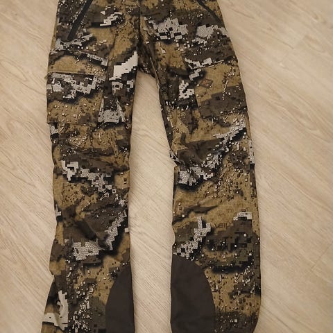 Kuvan ulkoilu/metsästyshousut, kokomitoitus D104 eli leveämpi mitoitus. Vyötärö 94cm, haarasta lahkeeseen 78cm. Kuva taskusta ja lahkeen kiristyksestä väärinpäin.